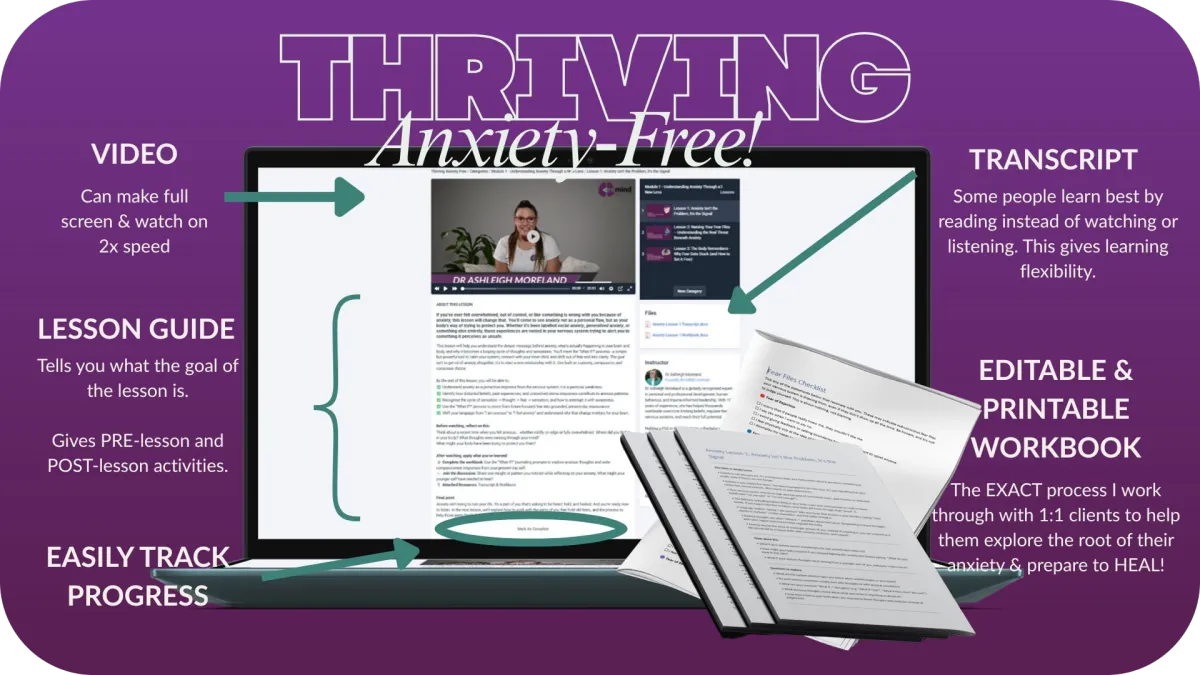 You’ll learn through video lessons, guided processes, and therapeutic workbooks that help you retrain your nervous system and break the anxiety loop for good.